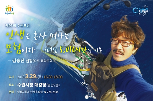 [시사인경제]수원시는 오는 29일 오후 4시 30분 수원시청 별관 대강당에서 ‘인생은 혼자 떠나는 모험이다: 209일 5016시간의 기록’을 주제로 제93회 수원포럼을 연다.