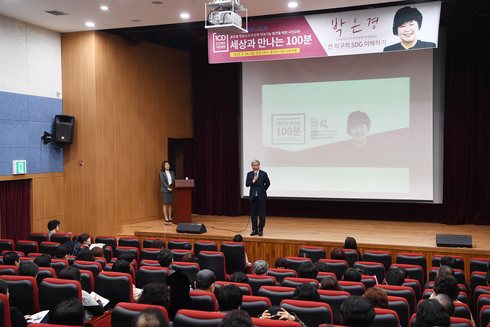 지난 26일에 진행된 첫 번째 특강은 ‘세상과 만나는 100분‘ 시민교육 특강의 전체적인 컨셉인 SDGs(지속가능 발전 목표)를 이해하기 위한 내용으로 유네스코 한국위원회 부위원장이자 통영지속가능발전교육재단의 박은경 이사장이 ‘전 지구적 SDGs 이해하기’라는 주제로 진행했다.