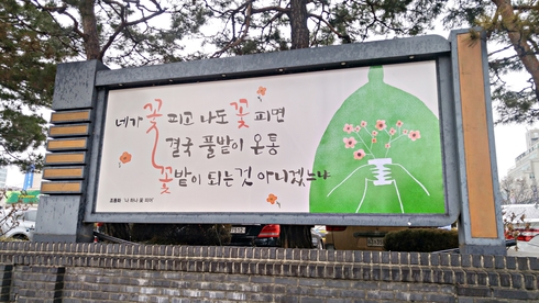 | 시청 정문 옆 담장에 게시된 수원희망글판 봄편 문안 |