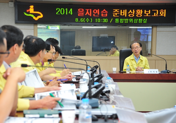 【경기인뉴스】수원시(시장 염태영)가 지난 6일 성공적인 을지연습을 위해 지난 6일 수원시청 통합방위상황실에서 제1부시장, 안전기획조정실장, 구청장, 국.소장, 유관기관 등 30명이 참석한 가운데 2014년도 을지연습 준비상황 보고회를 가졌다.