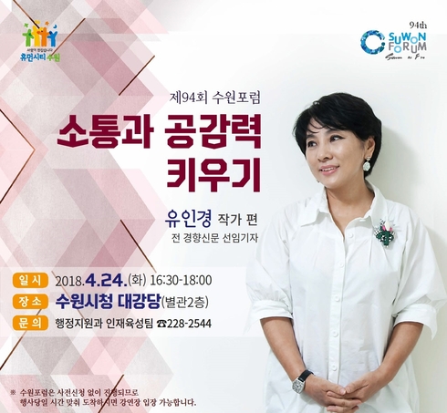 [시사인경제]수원시는 오는 24일 오후 4시 30분 수원시청 별관 대강당에서 ‘소통과 공감력 키우기’를 주제로 제94회 수원 포럼을 연다. 포럼은 경향신문 선임기자를 지낸 유인경 작가의 강연으로 진행된다.