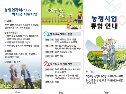 이에 구는 각 농정사업별 신청 시기와 자격요건, 지원내용 등을 일목요연하게 정리한 리플렛을 만들어 배부하고 있다.