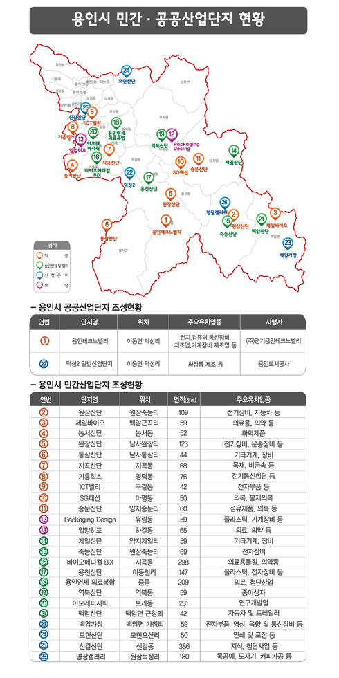 이에 따라 용인시에는 용인테크노밸리 등 공공산단 2곳, 아모레퍼시픽 등 민간산단 24곳 등 26개 산업단지가 조성된다.