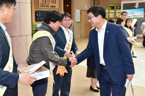 | 염태영 수원시장이 청렴 캠페인 참여자들을 격려하고 있다. |
