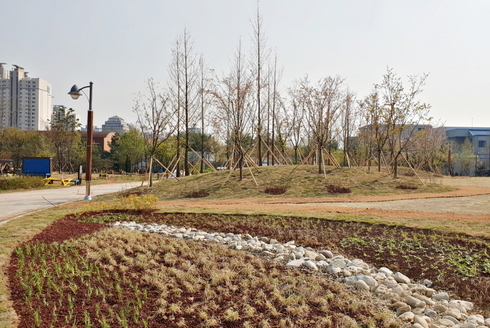 주변에는 야트막한 동산을 만들고 왕벚나무·메타세쿼이아·산수국을 심어 레인가든과 조화를 이루도록 했다. 지난달 초 청소년문화센터를 이용하는 초·중·고등학생 100여 명이 산수국을 심는 작업에 참여하기도 했다.