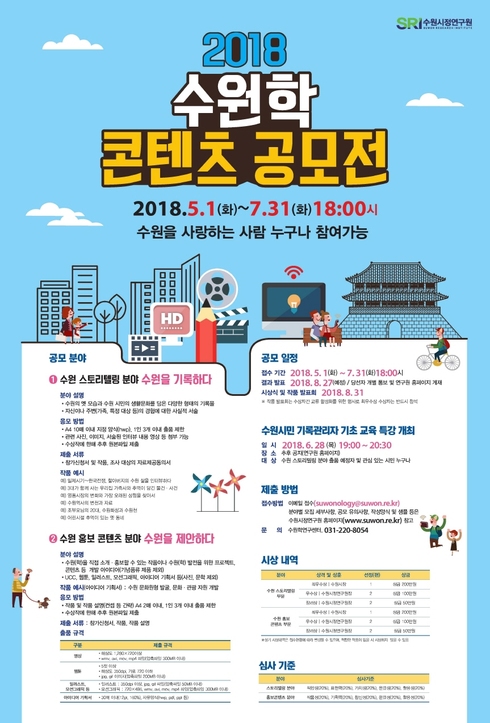 [시사인경제]수원시정연구원은 수원 지역 정체성을 공유하고 수원에 대한 시민의 관심을 불러일으키기 위해 ‘2018 수원학 콘텐츠 공모전’을 연다.