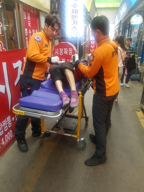 | 의식을 잃은 신 씨를 119대원이 옮기고 있다. |