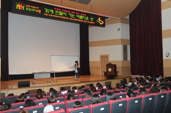 【경기인뉴스】채의선 기자 = 수원시에서는 지난 17일 시청 대강당에서 수원시민 500여명을 대상으로‘제2회 함께 만들어 가는 아름다운 성’이란 주제로 강연회가 열려 큰 호응을 얻었다. 이번 강연회는 성교육 전문가 구성애 강사를 초빙해 수원시민들에게 성에 대한 올바른 가치관을 심어주고 자녀와의 올바른 관계 형성을 인식시키기 위해 마련됐다.