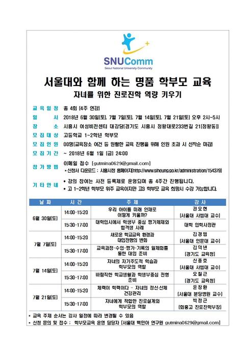 [시사인경제]시흥시는 서울대 사범대학과 함께 오는 6월 30일부터 ‘자녀 진로진학 지도 역량 강화’를 위한 학부모 진로교육을 실시한다.