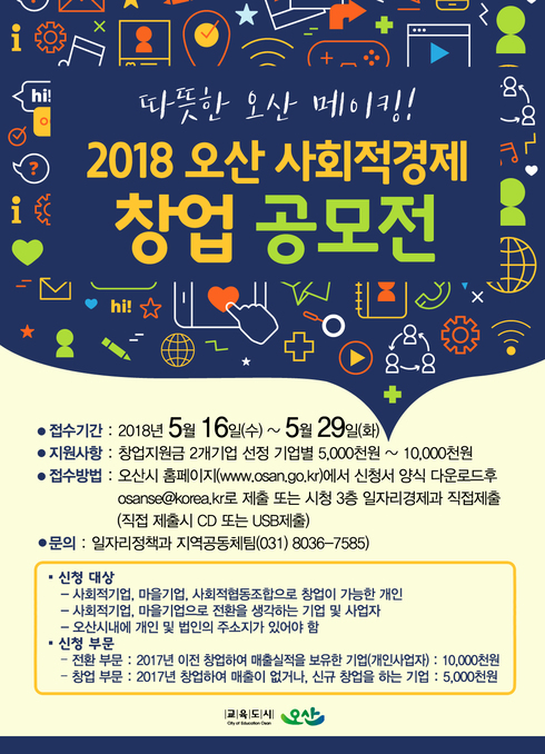 [시사인경제]경기도 오산시는 지역의 문제를 해결하고 일자리를 창출하는 사회적경제 창업 지원을 위해 ‘2018 오산 사회적경제 창업 공모전’을 개최한다고 밝혔다.