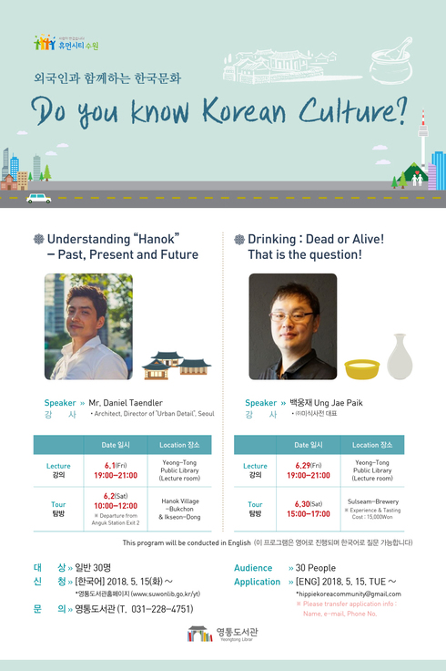 ‘한옥의 이해’, ‘음주-재료와 제조법에 따른 술 문화 비교’를 주제로 하는 프로그램은 각각 강의와 현장 탐방으로 구성된다.