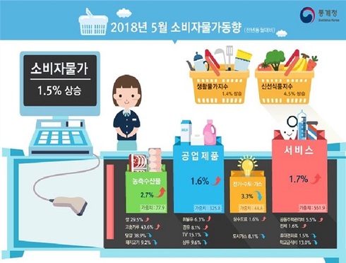 [시사인경제] 통계청이 1일 발표한 ‘2018년 5월 소비자물가동향’에 따르면 전월대비 0.1%, 전년동월대비 1.5% 각각 상승했다.