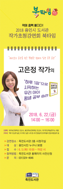 [시사인경제]용인시 죽전도서관은 오는 22일 유명 저자를 초청해 강연을 듣는 ‘북타임’ 강좌로 ‘하루 1장 공부 습관’의 저자인 고은정 작가의 강연을 개최한다.