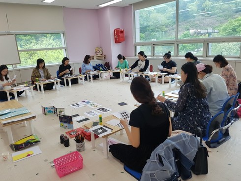 | 소담태교프로그램에서 태교책을 만들고 있는 임신부들 |