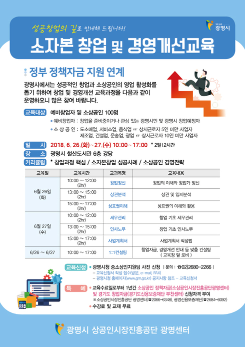 [시사인경제]광명시는 오는 26일과 27일까지 2일간 철산도서관 6층 강당에서 예비창업자와 기존 사업자 중 경영개선 희망자, 취업난으로 어려움을 겪고 있는 구직자 등을 대상으로 ‘2018년 소자본 창업 및 경영개선 교육’을 무료로 실시한다.