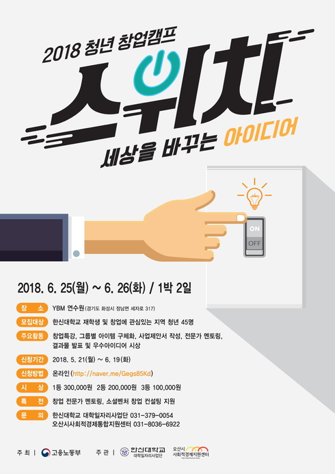 [시사인경제] 오산시 사회적경제지원센터와 한신대학교 대학일자리사업단이 공동주관하는 '2018 오산 청년 창업캠프'가 오는 25일에서 26일 2일간 YBM 연수원에서 열린다.