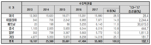 주요 수출국은 미국, 일본, 대만 등의 순이며, 이들 3개국이 전체의 68.3%를 차지하고 있다.