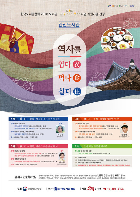 [시사인경제]안산시 관산도서관은 '2018년 도서관 길 위의 인문학' 공모 사업에 선정됨에 따라 '역사를 입다 먹다 살다'라는 주제로 인문학 프로그램을 6월부터 오는 10월까지 진행한다고 11일 밝혔다.