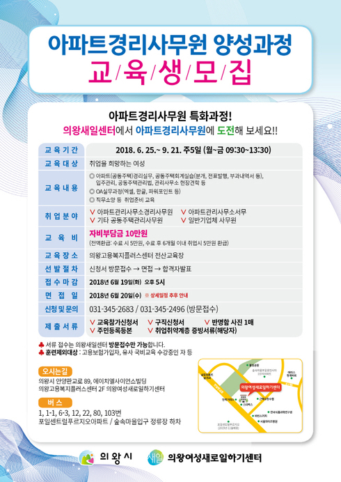 [시사인경제]의왕여성새로일하기센터는 경력단절 여성들의 취업 지원을 위해 직업교육훈련 ‘아파트 경리사무원 양성과정’에 참여할 교육생을 모집한다.