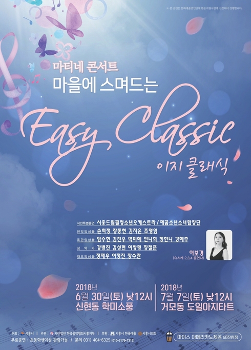 [시사인경제]시흥시가 주최하고 한국음악협회 시흥시지부가 주관하는 마티네 콘서트 ‘마을에 스며드는 이지 클래식’이 오는 30일 신현동 학미소풍과 7월 7일 거모동 도일아지타트에서 개최된다.