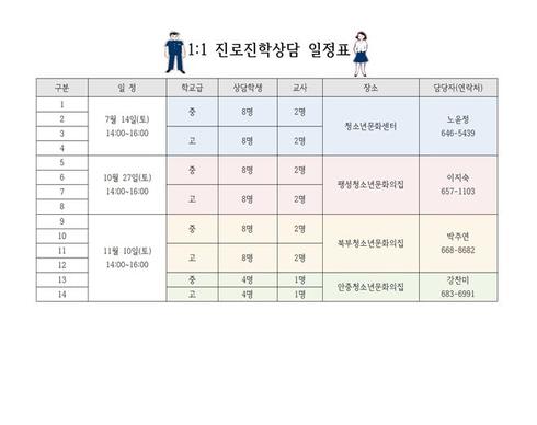진로체험지원센터와 경기도진로진학교사협의회와 연계하여 중·고생들에게 맞춤식 상담을 통한 진로·진학 정보를 제공하여 학생들이 진로를 스스로 설계할 수 있도록 도움을 줄 예정이다.