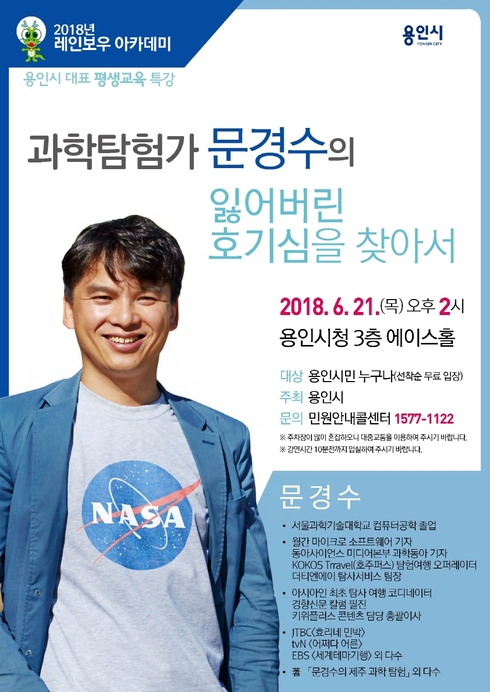 [시사인경제]용인시는 오는 21일 시청 에이스 홀에서 시민을 위한 명사 초청 무료강좌인 ‘레인보우 아카데미’의 6월 행사로 과학탐험가 문경수의 특강을 마련한다.
