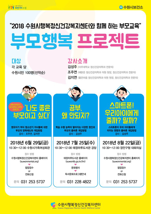 수원시행복정신건강센터 관계자는 “부모라면 누구나 갖고 있는 고민을 함께 해결하고, 자녀의 정신건강에 대한 이해를 높여줄 이번 공개강좌에 많은 시민들이 참여해주길 바란다”고 말했다.