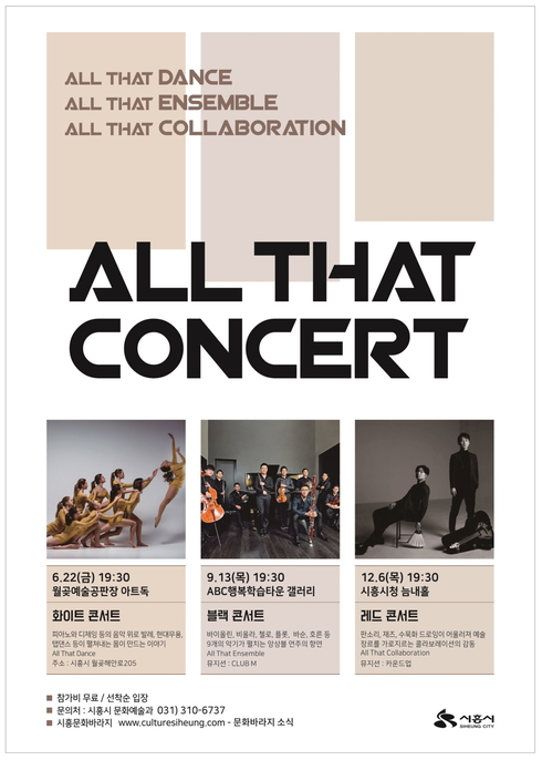 매년 시흥시민의 문화예술 향유와 창조력 함양을 위해 진행되는 〈올댓 콘서트〉가 올해에는 이른 여름시즌에 찾아왔다. 〈올댓 콘서트〉의 첫 번째 에피소드인 〈화이트 콘서트〉를 통해 사랑하는 가족, 연인, 친구와 함께하는 신나는 ‘춤의 바캉스’를 떠날 수 있기를 기대한다. 본 공연은 별도의 접수절차 없이 누구나 참여 가능하며 참가비는 무료이다.