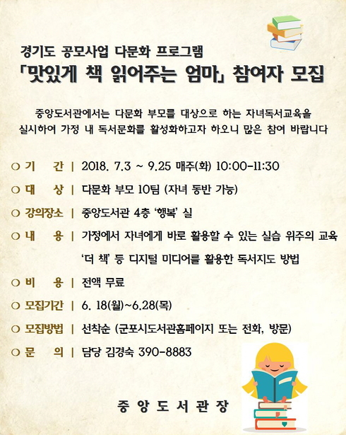 경기도 정보소외계층 독서프로그램 공모사업으로 선정된 ‘맛있게 책 읽어주는 엄마’ 프로그램은 다문화 가정의 독서문화 활성화를 위해 마련됐으며, 오는 7월부터 9월까지 매주 화요일 오전 10시에 12회에 걸쳐 실시된다.