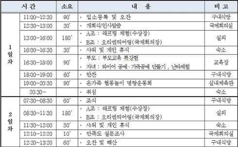 이틀간 진행되는 행사는 온 가족이 함께하는 수상 래프팅체험, 가족의 협동심과 성취감을 증진하는 가족화합 오리엔티어링 프로그램, 명랑운동회, 부모교육 특강, 가죽공예 만들기 체험활동 등으로 다채롭게 꾸려진다.