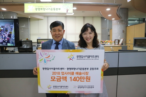 [시사인경제]광명시가 광명업사이클아트센터가 광명희망나기본부와 함께 지난달 매주 토요일마다 열었던 업사이클 예술시장에서 얻어진 수익금의 일부를 지난 26일 문화소외청소년 사업을 위해 기부했다.