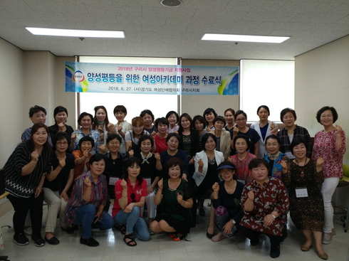 [시사인경제]구리시와 경기도여성단체협의회 구리시지회는 지난 27일 양성 평등 문화 확산을 위해 조성된 2018년 양성 평등 기금 사업으로 양성 평등을 위한 ‘여성 아카데미’ 제1기 교육 사업을 성황리에 마치고 수료식을 진행했다.