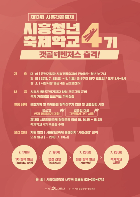 시흥청년축제학교는 시흥시 청년문화기획자 양성 발판 마련을 위해 기획된 것으로, 오는 7월 28일부터 9월 1일까지 매주 토요일 진행되며 수강료는 무료다. 접수는 시흥갯골축제 공식홈페이지의 사전신청 메뉴를 통해 할 수 있다.