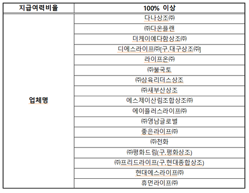 보험업 분야에서는 지급여력비율 100%를 기준으로 보험금 지급 능력을 판단하고 있는데, 상조업의 경우도 이와 유사한 측면이 있는바, 지급여력비율 100%를 기준으로 상위업체를 선정했다.