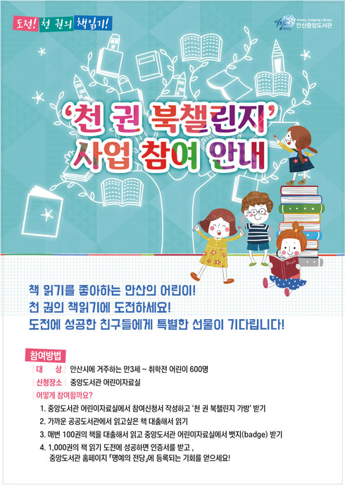 ‘도전! 천 권의 책읽기’라는 부제로 시작하는 '천 권 북챌린지'는 안산에서 시행중인 북스타트사업 참여 영유아가 사업 참여기간이 종료된 이후에도 독서활동을 생활 속에서 꾸준히 이어갈 수 있도록 전개하는 사업이다.