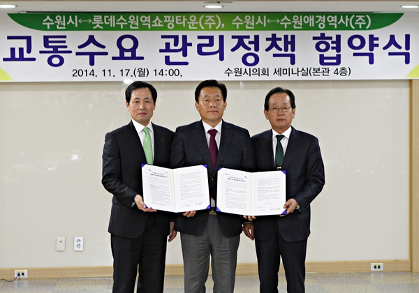 【경기인뉴스】수원시(시장 염태영)와 롯데수원역쇼핑타운(주)(대표이사 김창권), 수원애경역사(주)(대표이사 심상보)는 17일 수원시의회 세미나실에서 수원역 주변 교통수요 관리정책 협약을 체결했다.