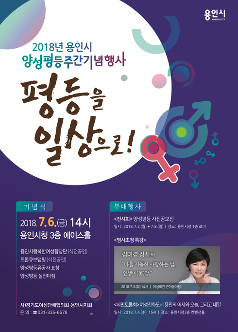 [시사인경제]용인시는 양성평등주간을 맞아 ‘평등을 일상으로’를 주제로 기념식과 전시회, 특강, 토론회 등 다양한 기념행사를 마련한다.