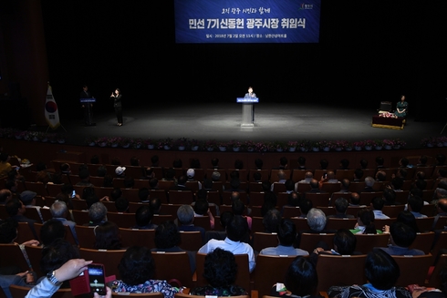 이날 취임식에는 시민과 직원 등 1천500여명이 참석한 가운데 광주시립광지원농악단과 광주시민합창단의 식전공연에 이어 국민의례, 문재인 대통령의 축하메시지 낭독, 취임선서, 취임사, 시민과 함께 종이비행기 날리기 퍼포먼스 순으로 진행됐다.