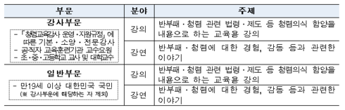강의분야는 청탁금지법, 공직자행동강령, 부패 및 공익신고 보호·보상 등 반부패·청렴과 관련한 현행 법령 또는 제도 등을 내용으로 하는 교육용 강의를 공모한다.