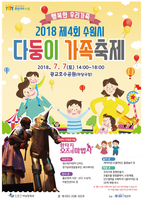 이날 축제는 어린이 가족뮤지컬 ‘환타지 오즈의 마법사’, 잼스틱, 레크리에이션 등 프로그램으로 진행된다. 다둥이 가족뿐 아니라 모든 시민이 참여할 수 있다. 행사는 오후 6시까지 이어진다.