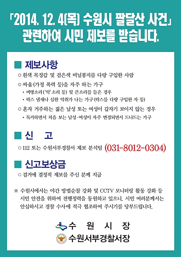 【경기인뉴스】수원시가 지난 4일 발생한 팔달산 사건의 조기 해결을 위해 긴급 임시반상회를 열고 시민제보사항 홍보에 나섰다.