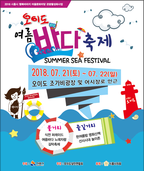 올해로 2회째를 맞이한 ‘2018 오이도 바다 축제’는 주민들이 직접 참여하는 대취타대, 신바람 풍물패, 색소폰 연주 등 다채로운 공연과 노래자랑이 펼쳐질 예정이며 이현숙, 천상, 유화의 축하공연이 흥겨운 분위기를 더할 것으로 기대된다.