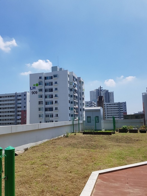 6층 옥상은 군데군데 비어있는 잔디를 메우고 입구 한 편에는 영산홍을 심어 꽃이 만발하는 4∼5월에 환한 분위기를 느낄 수 있도록 했다.