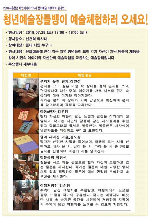[시사인경제]시흥시는 오는 28일 소사원시선 신천역 역사내에서 〈청년예술장돌뱅이〉 예술체험 행사를 개최한다.