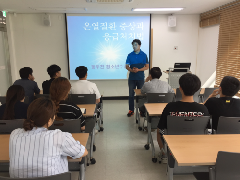 이번 교육은 최근 연일 37도 이상의 고온이 계속되는 상황에서, 여름방학을 맞이한 청소년들이 과도한 활동으로 온열손상에 의한 사고가 발생할 수 있는 가능성에 대비해, 열사병, 열탈진, 열경련 등의 올바른 응급상태 파악과 신속한 응급처치에 대하여 집중적으로 교육하여 청소년수련관의 지도사 및 종사자들의 응급처치 능력을 배양시켰으며, 프로그램 참여자의 활동 전 건강상태 체크, 휴식 중 수분 보충, 응급환자 발생 시 즉각적인 보고체계 유지, 기온에 따른 탄력적 냉방 실시 등을 각별히 당부했다.