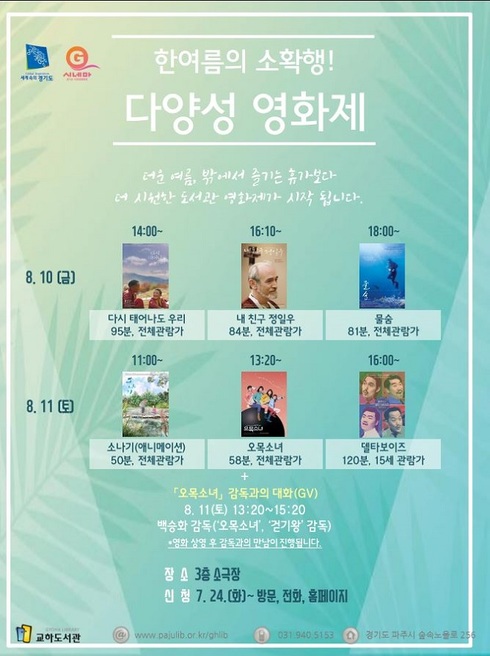 [14-20180801103217.jpg][시사인경제]파주시 교하도서관은 여름 휴가시즌을 맞아 ‘한 여름의 소확행! 다양성 영화제’를 개최해 시민들에게 질 좋고 재미있는 영화 관람 기회를 제공할 예정이다.