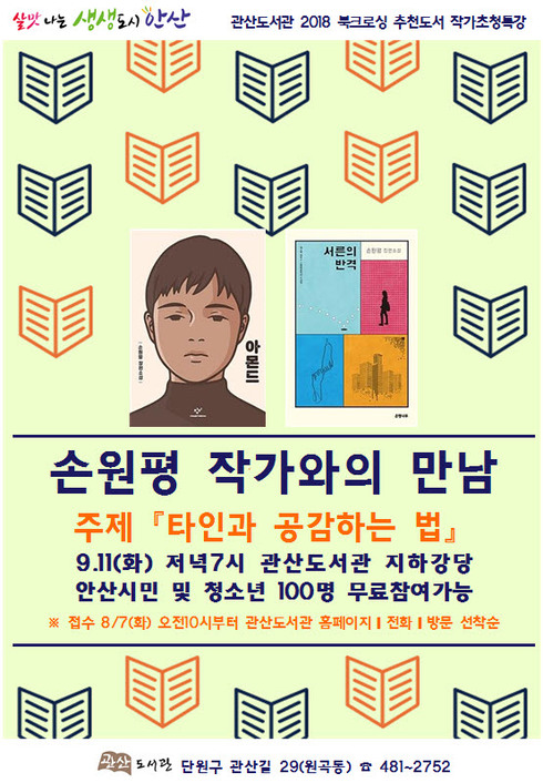 손원평 작가와의 만남은 안산시민이면 누구나 무료로 참여할 수 있으며, 관산도서관 홈페이지와 전화 및 방문을 통해 신청할 수 있다.
