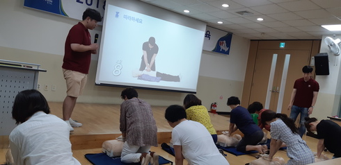 오늘 교육은 가정이나 주변에서 접할 수 있는 심정지환자가 발생했을 시, 당황하지 않고 현장에서 119 구조대에 신고함과 동시에 먼저 심폐소생술을 실시하는 방법과 구조 및 응급처치를 할 수 있는 교육으로 진행됐다