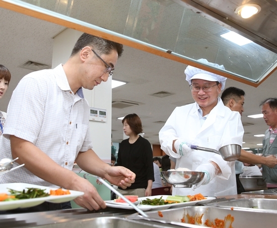채 시장은 뜨거운 삼계탕 그릇을 손수 식판에 올려주며, 에어컨바람도 없이 더운 날씨와 씨름하며 근무하는 직원들을 격려했다.