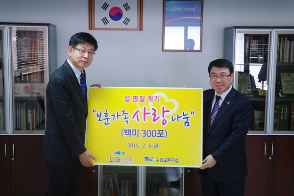 【경기인뉴스】수원보훈지청(지청장 이재익)은 지난 6일 설 명절을 맞이하여 고령 및 독거 등으로 어렵게 생활하시는 보훈가족의 소외감을 해소하고 따뜻한 설 명절을 보낼 수 있도록 LIG넥스원(대표 이효구) 후원 ‘보훈가족 사랑의 쌀 전달식’을 가졌다.